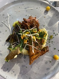 - Main: Seared Duck Breast, Duck Leg and Beef Short Rib Trio, with roast garlic mashed potato, pak choi, turnip, papaya and gooseberry gremolata