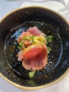 - Starter: Tuna Tataki, with cucumber and kiwi fruit salsa, pickled ginger and teriyaki